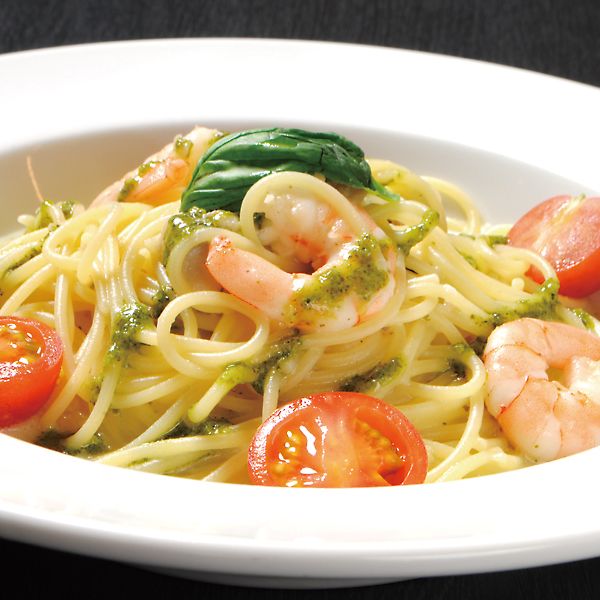 写真のパスタはエビとホタテのバジルクリーム。パスタは注文が入ってから茹でるので、一番おいしい状態でご提供!麺はモチモチで風味も◎常時20種類のパスタをご用意しているので、お好みの味をお選びいただけます。