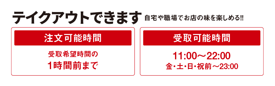 ※ご注文は最短で受取希望時間の1時間前までとなります。店舗の営業時間外の場合、ご注文を受付できない場合がございます。